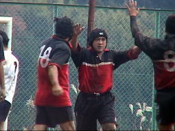 しかし、後半6分には、ライン攻撃の球をインターセプトされて、独走トライを許してしまう。 ゴールも決まり0対21。 もう、これで終わってしまうのであろうか・・・。 しかし、今日のJKは諦めなかった。 トライを奪われた直後のキックオフからも攻込み、ほとんど敵陣で試合を進めた。 そして、17分には、相手ゴール前の連続攻撃から今日はPRに入っていた三宅が、相手を吹っ飛ばしてゴールに飛び込んだ。 トライの後、興奮した彼は思わず大声で「エイドリアーーーン!!」と絶叫した(聞きたい人は試合ビデオをみてね)。 ゴールも決まって7対21。